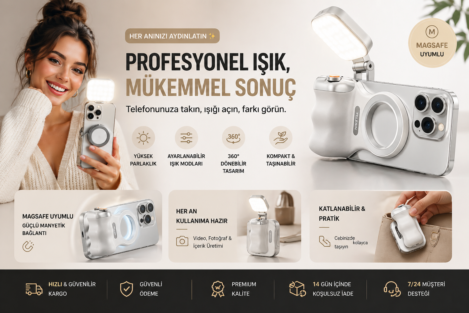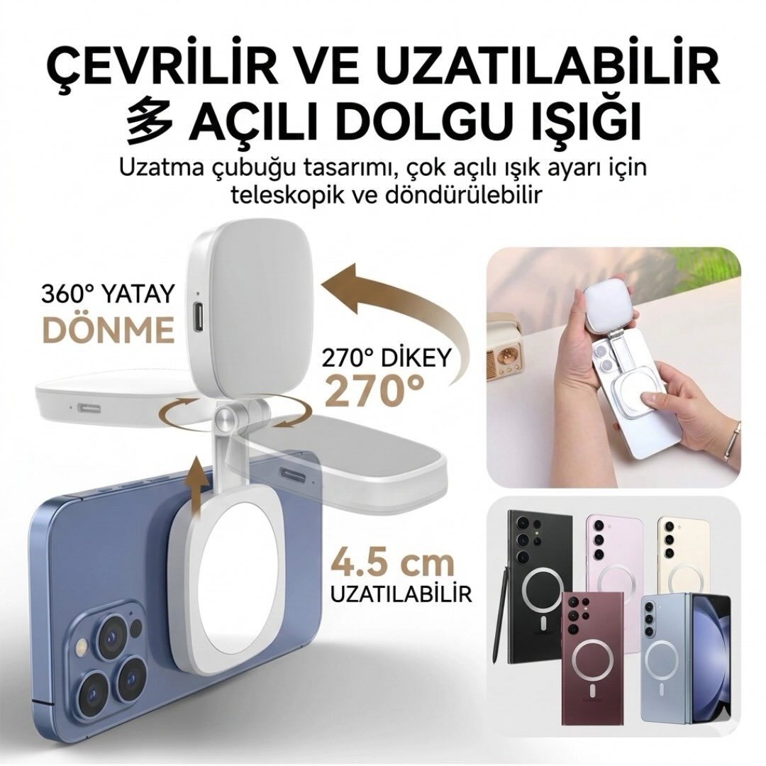 Bu MagSafe uyumlu tutucu ile tek elde stabil çekim yap, LED ışıkla her ortamda profesyonel sonuç al.